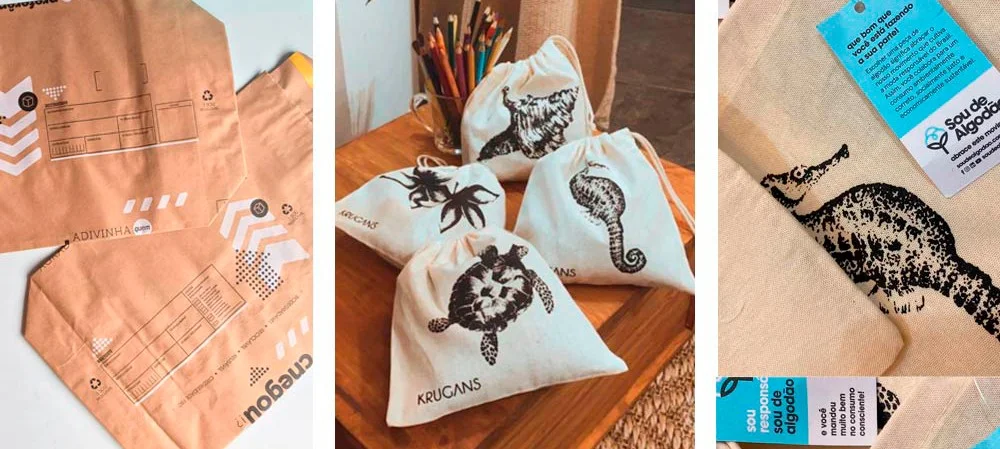 Nossos envelopes para envio do ecommerce são confeccionados em papel kraft, 100% biodegradável e reciclável. E as charmosas sacolinhas que embalam nossas peças são confeccionadas com algodão orgânico <3